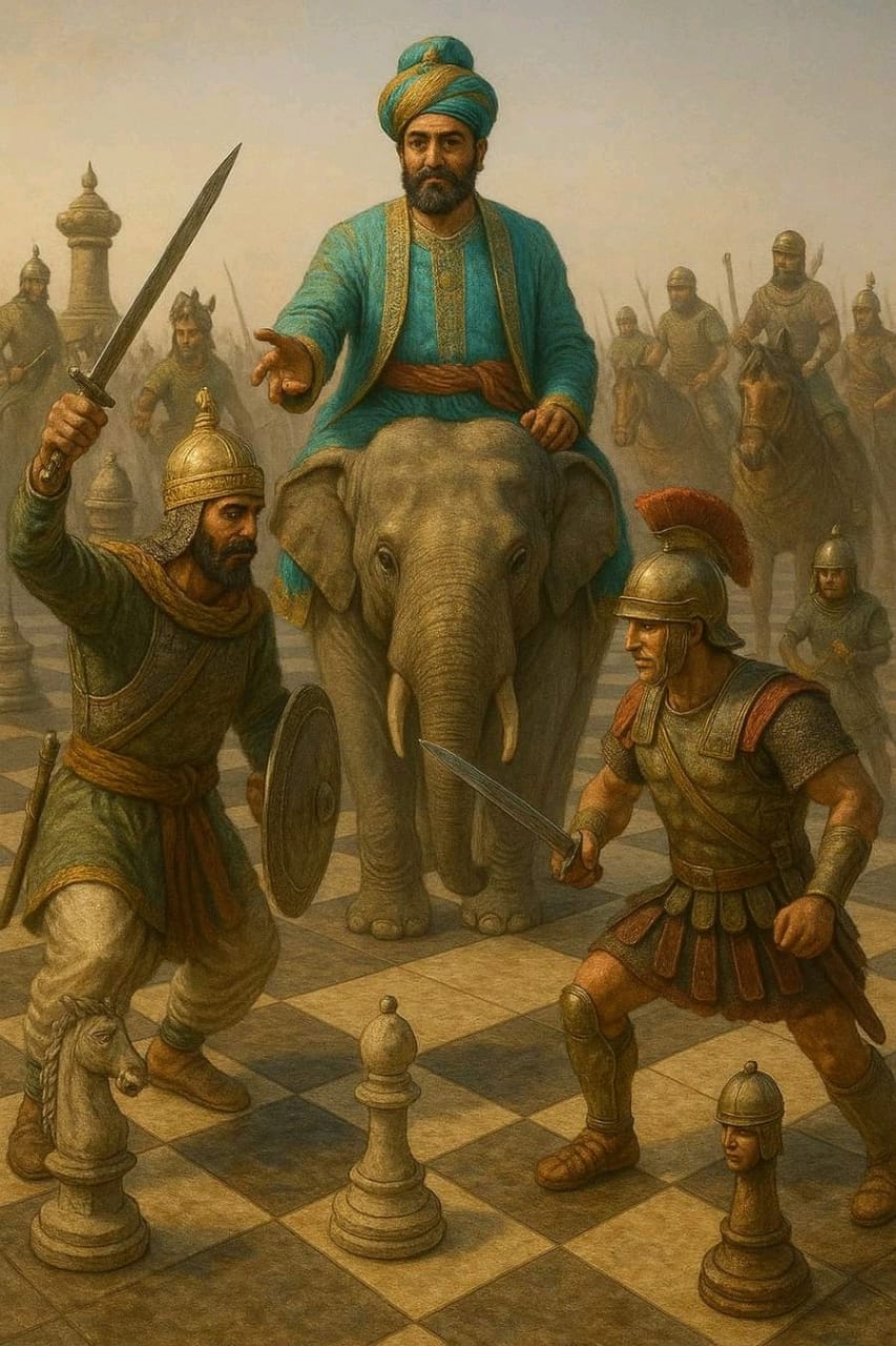 🌄 Índia, século VI – Ao som dos mantras e do tilintar de sinos em templos antigos, nas cortes de reis e entre os generais de guerra, nasce um jogo que refletia a própria arte da estratégia: chaturanga. Inspirado pelos quatro pilares do exército a infantaria, os cavalos, os elefantes e os carros de guerra, esse jogo não era apenas entretenimento, mas um espelho das batalhas da vida real.